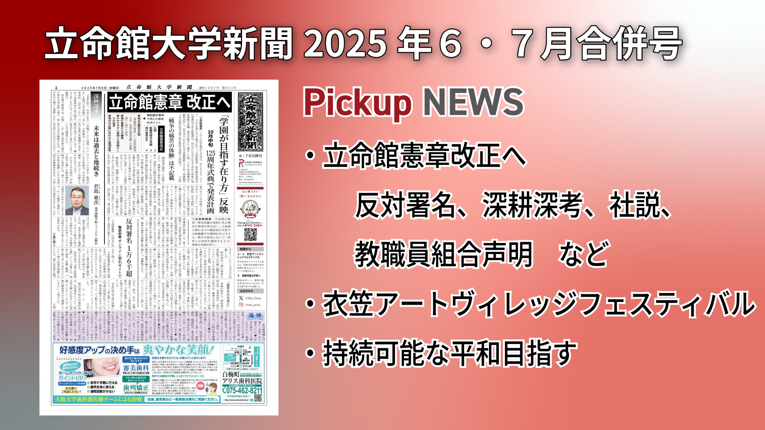 電子版立命館大学新聞2025年6・7月合併号 ritspress 2025年7月9日 ■掲載記事《1面》・立命館憲章 改正へ ・反対署名1万6千超 有志の会 ・[深耕深考]未来は過去と地続き 君島東彦・国際平和ミュージアム館長 など《2面・3面》・[社説]立命館憲章改正 全構成員が納得できる手続きを ・衣笠アートヴィレッジフェスティバル ・憲章改正 教職員組合四役が見解 ・[立人]栗川治さん 失明も進んだ研究の道 など《4面》・持続可能な平和 目指す 倉本芽美さん など立命館大学新聞2025年6・7月合併号(825) 立命館憲章改正
