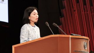 講義を行ったのは、本学経済学部・島田幸司教授が担当する教養ゼミナール「カーボンニュートラル入門」を受講した荒木ひかるさん(国関1)、小毛田慶花さん(国関1)、小林楓さん(国関1)の3人。「大阪万博におけるカーボンニュートラルの取り組み」というテーマで、カーボンニュートラルに関する学びの成果を発表した。