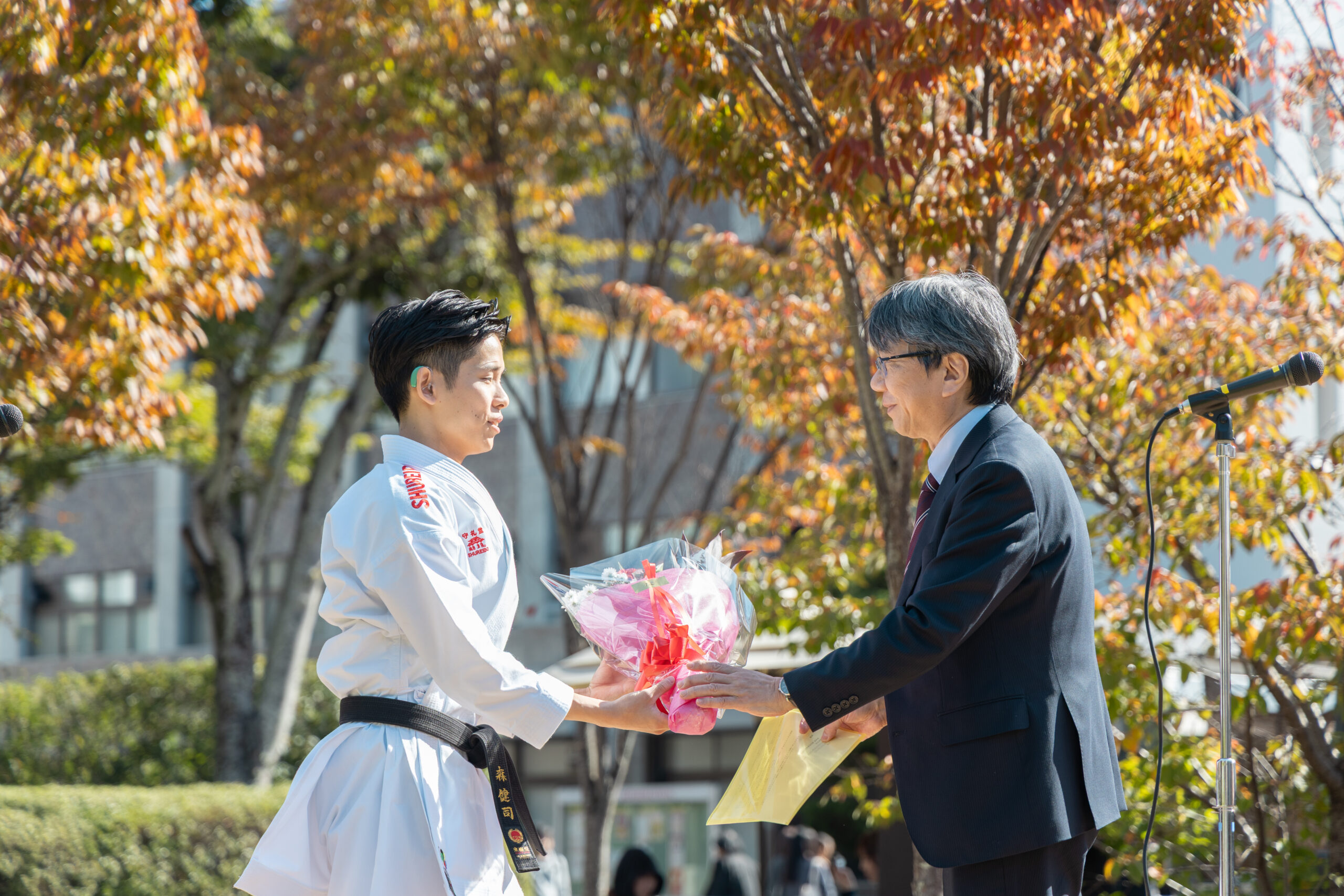 産業社会学部長の黒田学教授は「歴史ある大会で活躍されること、本当に誇りに思う」とエールを送り、森選手に花束を手渡した。