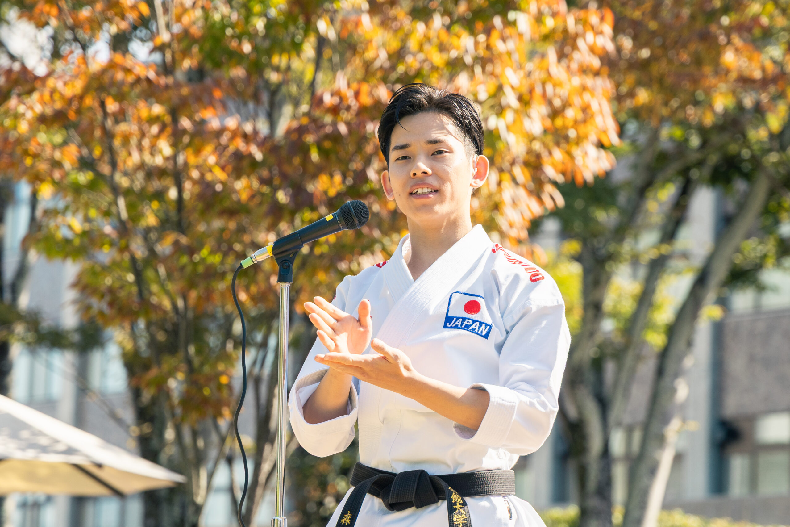15日に開幕する聴覚障害者の国際大会「東京2025デフリンピック」の空手日本代表に選出された、本学体育会の空手道部の森健司選手(産社3)の壮行会が10月29日、衣笠キャンパスの東側広場で開かれた。昼休みの芝生には多くの学生が集まり、応援団と共にエールを送った。