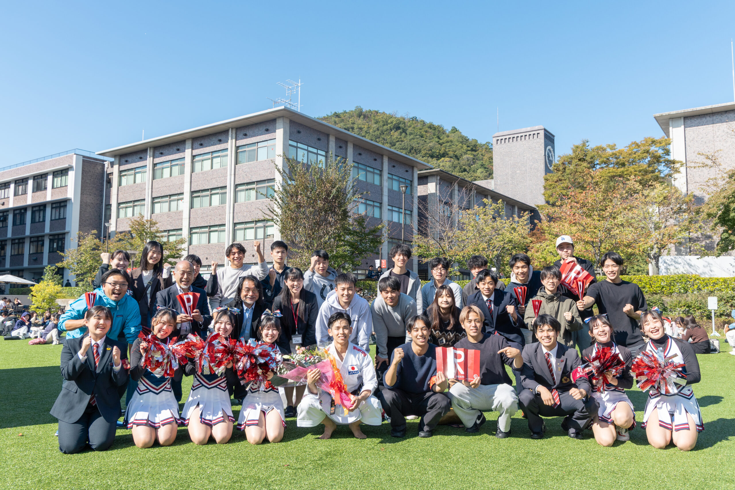 森選手は壮行会後、応援団の学生らと共に記念写真に納まった=10月29日午後、京都市北区・衣笠キャンパス(小林)