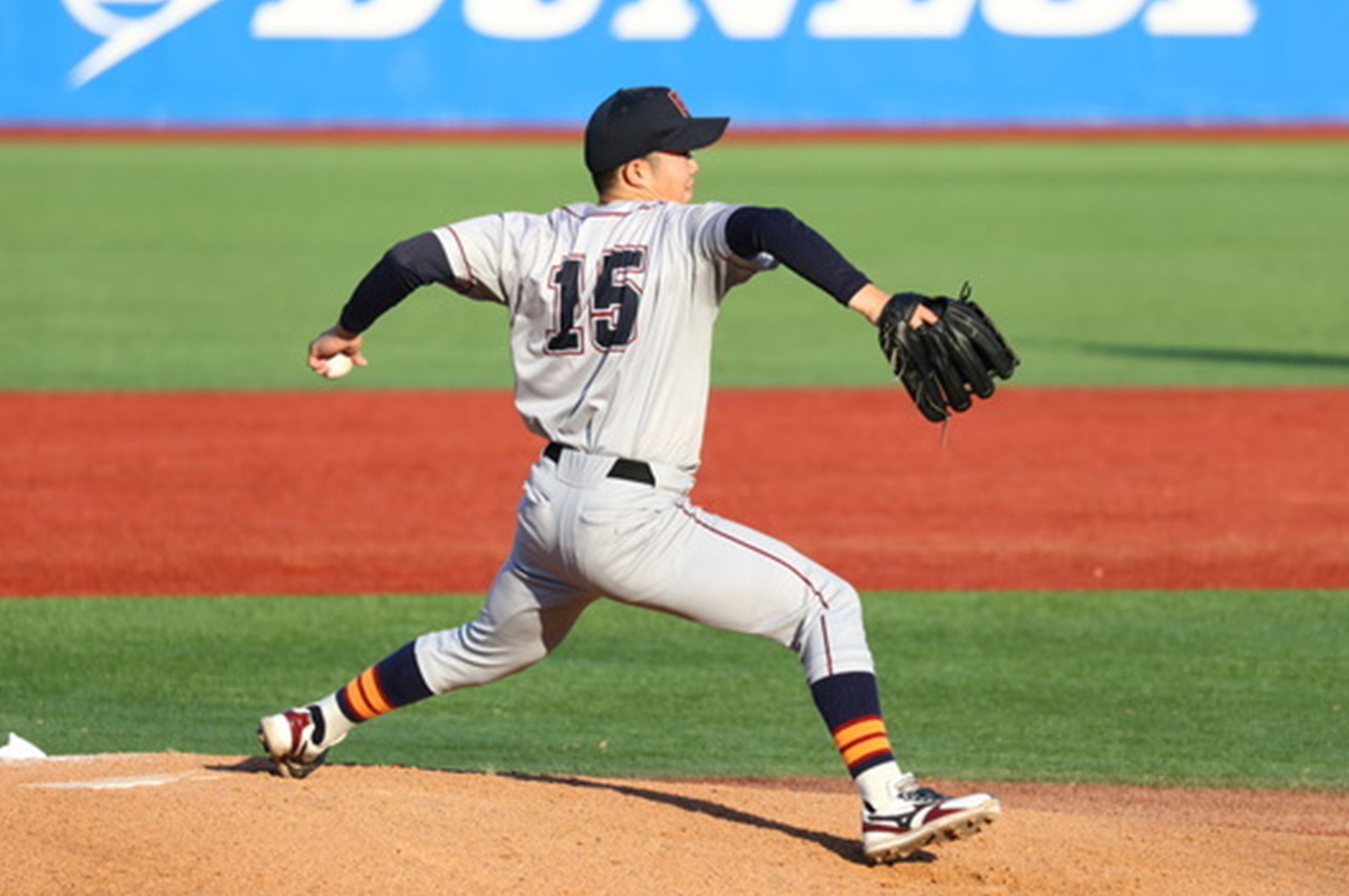 本学の先発は、関西学生野球連盟秋季リーグで最優秀投手に選ばれた遠藤翔海(産社4)。楽しげな表情を見せ、1回裏は走者を出すも無失点で抑えた。