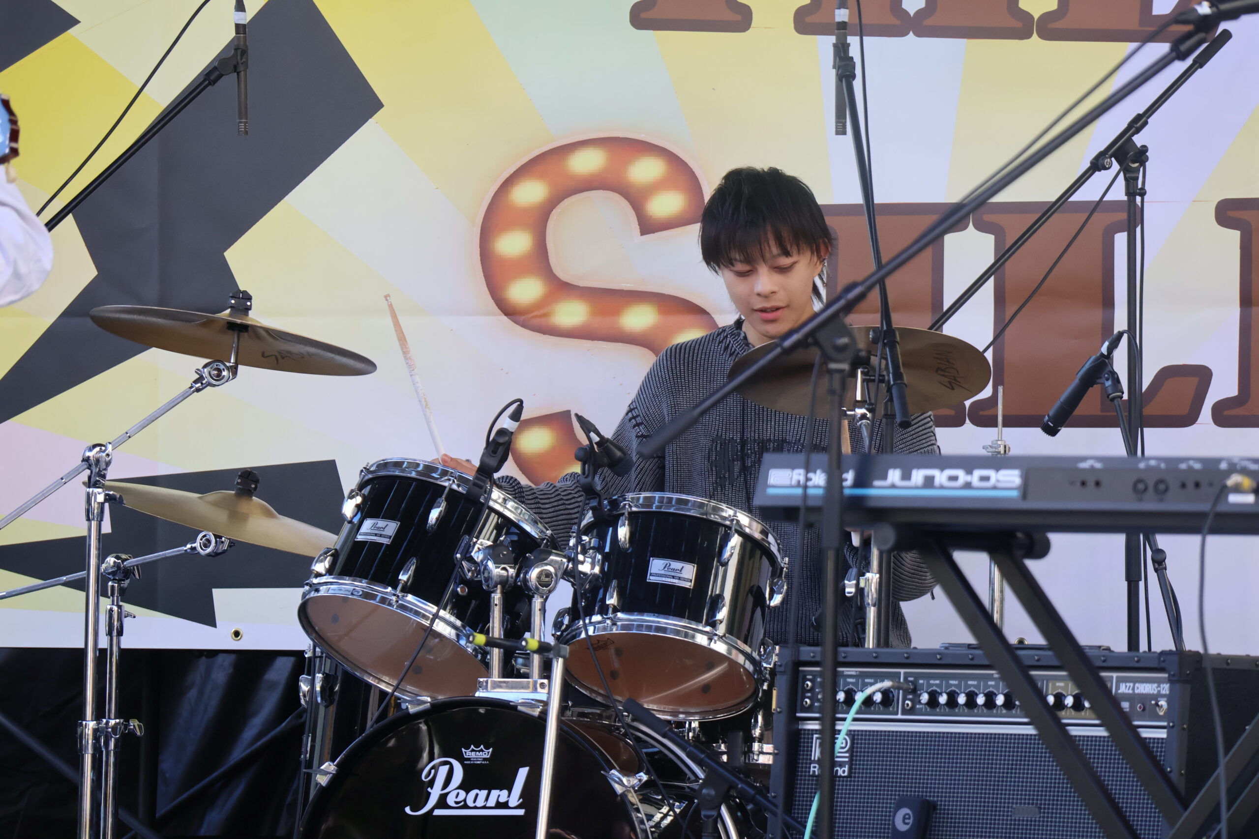 ドラムを演奏する山本さん(堀ノ内、真田)