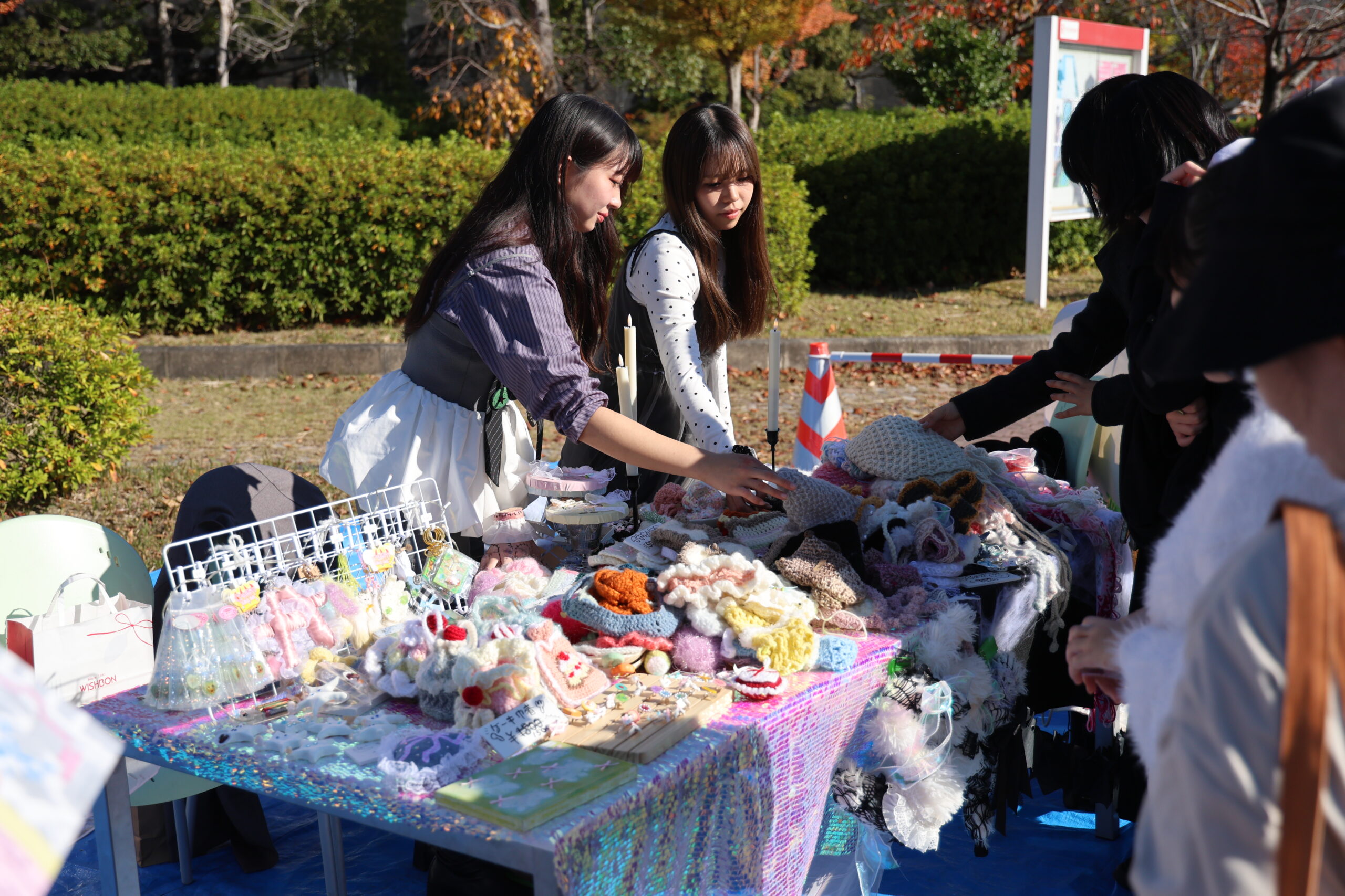 立命館珈琲研究会RCS.BKCのブースフリーマーケットスペースの一角では、Süß(ズュース)がハンドメイド作品を販売した。主に編み物を中心とした髪飾りや雑貨で、子どもから大人までの女性客を引き付けていた。出店していたのは、ハンドメイド好きの4回生の友人グループ。長谷川ららさん(理工4)は「自分が作ったものを他の人が買ってくれるのは初めての経験で、とてもうれしい」とほほ笑みながら話した。