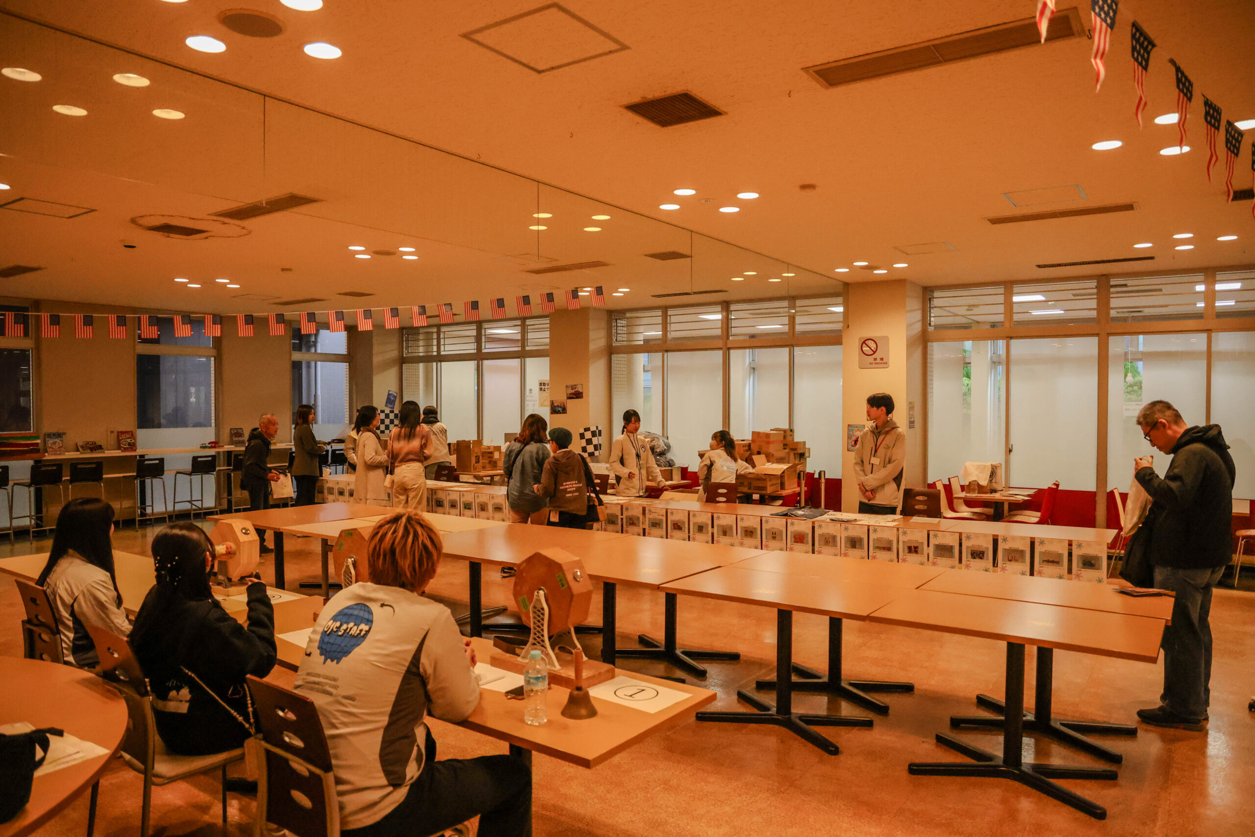 リンクスクエアに設けられた選会の会場グッズの作成を担当した疋田(ひきた)匠さん(理工3)は、グッズを作成する際には、「どんな人でも使える」ことを意識したという。