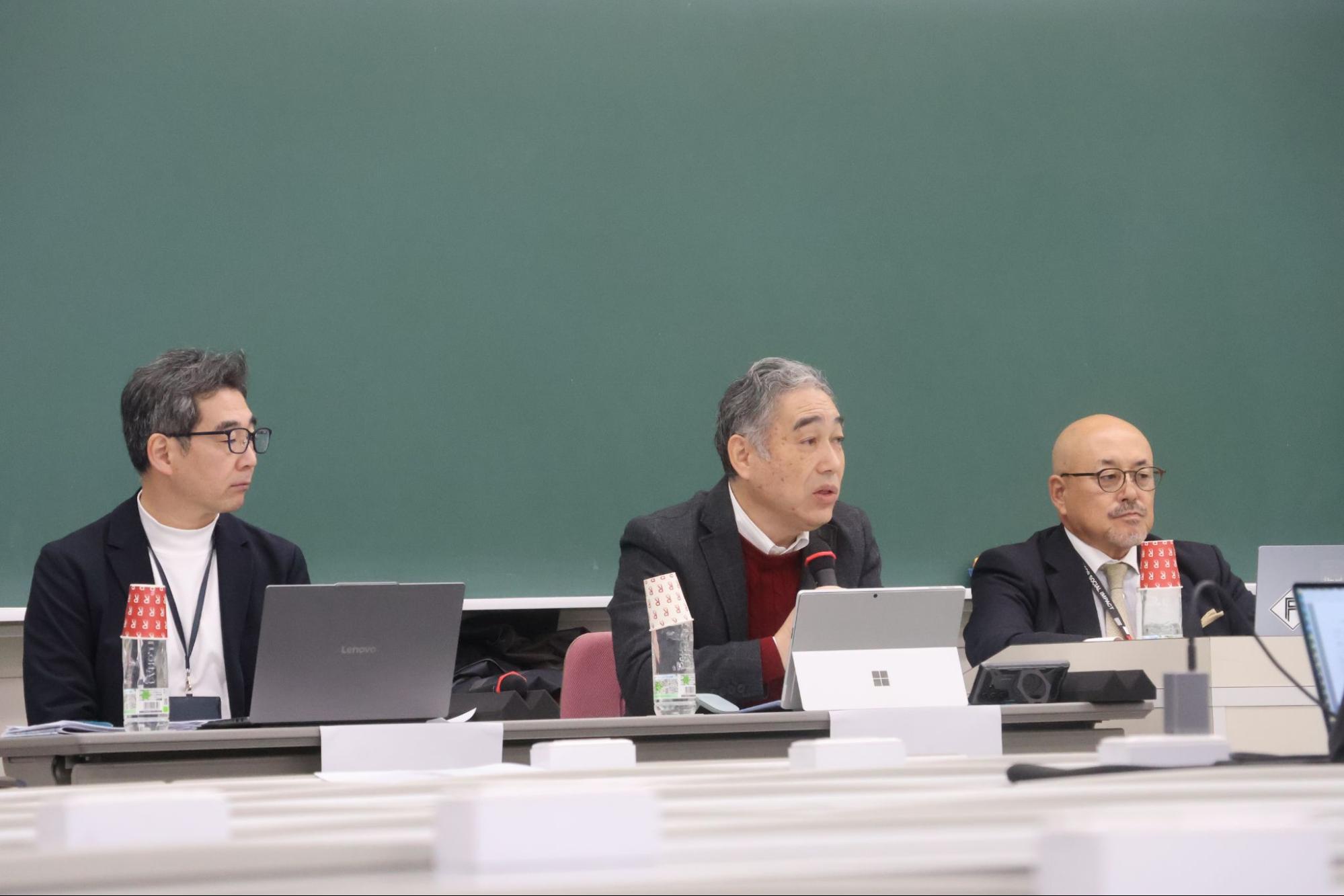 懇談会では、種子田穣・学園広報室長が司会を務め、立命館憲章改正検討委員会で委員長を務めた高山茂・副総長と、事務局長を務めた山下範久・常務理事が登壇した。